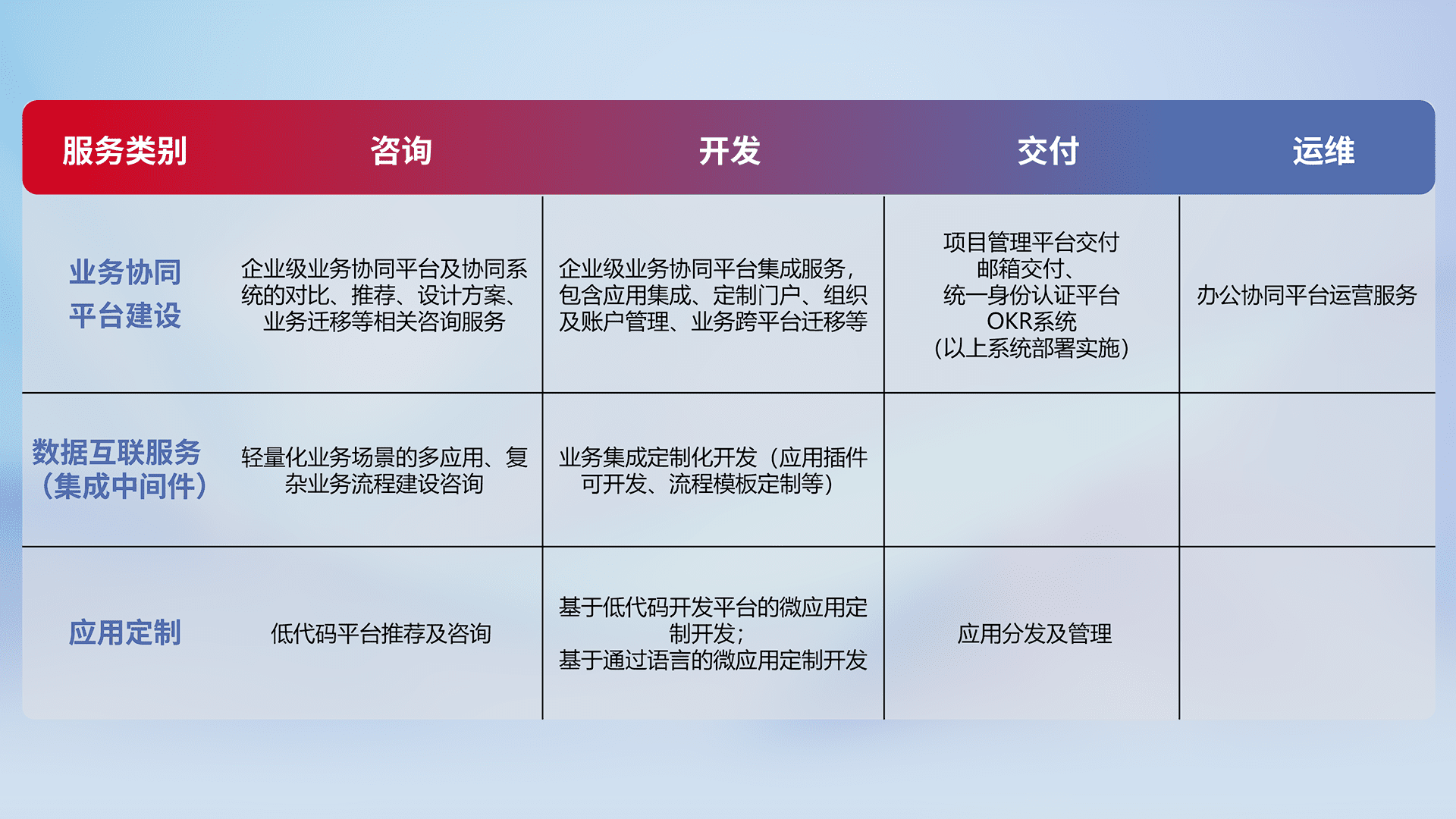 针对钉钉、、、、企微、、、、IDaas等平台级产品提供产品的规划、、方案、、、、交付、、、、定制化开发等服务,,,实现如统一协同办公、、智能客户服务、、、混合会议管理、、、智能数据查询、、、等业务场景,,,实现数字化转型。。。。