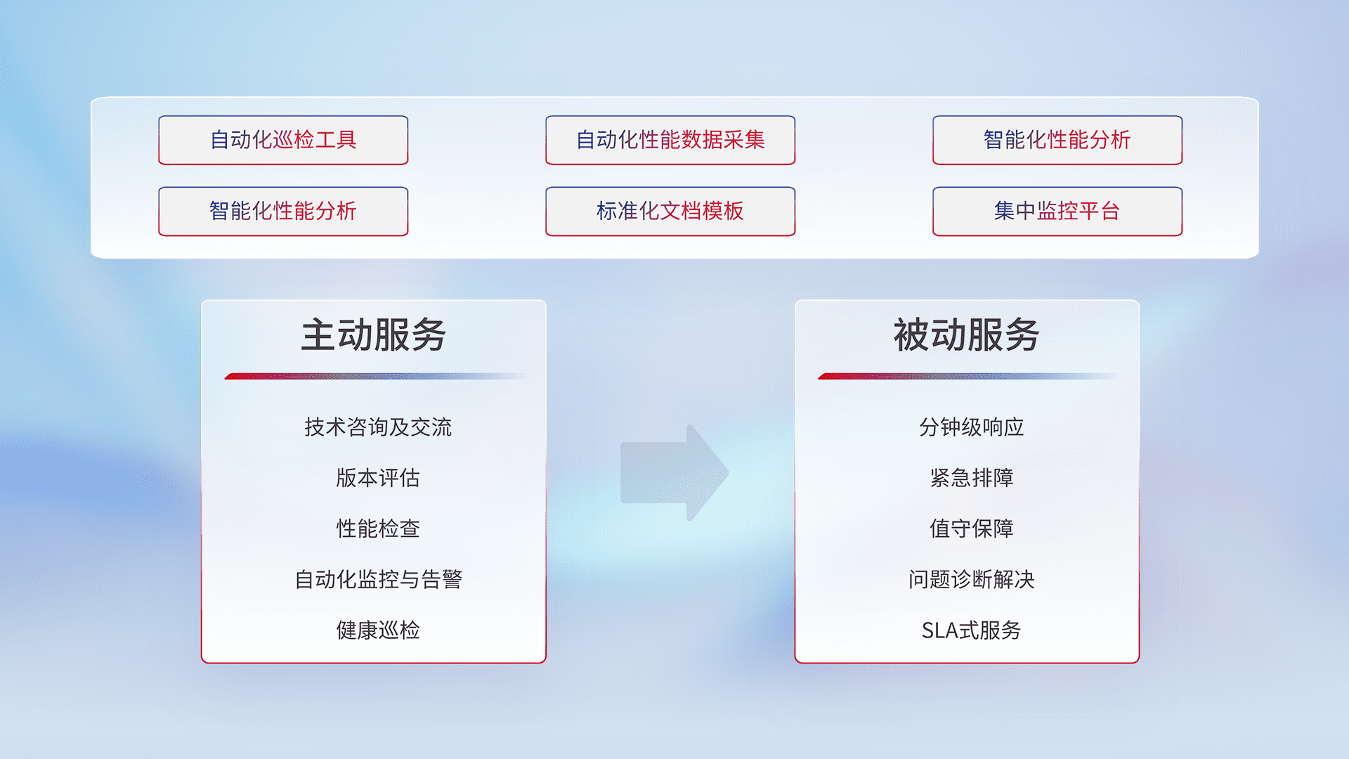 智能化工具和标准化文档,,,,保障服务质量,,,提供主动服务(包含技术咨询、、版本评估、、性能检查、、、、自动化监控与告警、、、健康巡检)和被动服务包含(分钟级响应、、、紧急排障、、、、值守保障、、、、问题诊断解决、、、SLA服务)。。。